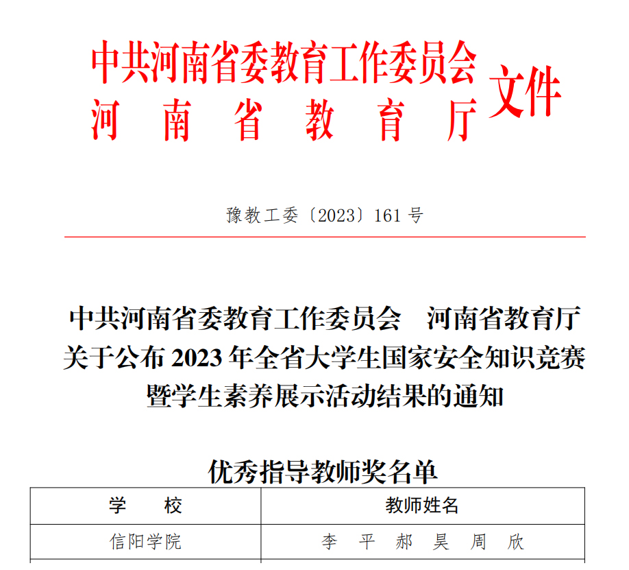 近日,中共河南省委高校工委、河南省教育厅印发《关于公布2023年全省大学生国家安全知识竞赛暨学生素养展示活动结果的通知》(豫教工委办〔2023〕161号)显示,我校学生积极参与,表现出良好素养,李平、郝昊、周欣3名教师获得“指导教师奖”。