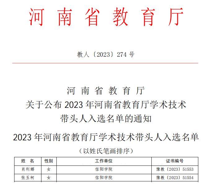近日,河南省教育厅下发《关于公布2023年河南省教育厅学术技术带头人入选名单的通知》(教人【2023】274号),经学校推荐、专家评审、结果公示等程序,我校理工学院副教授肖利娜、马克思主义学院副教授张玉柯荣获“2023年河南省教育厅学术技术带头人”荣誉称号。截至目前,我校入选河南省教育厅学术技术带头人的青年教师已达16人。