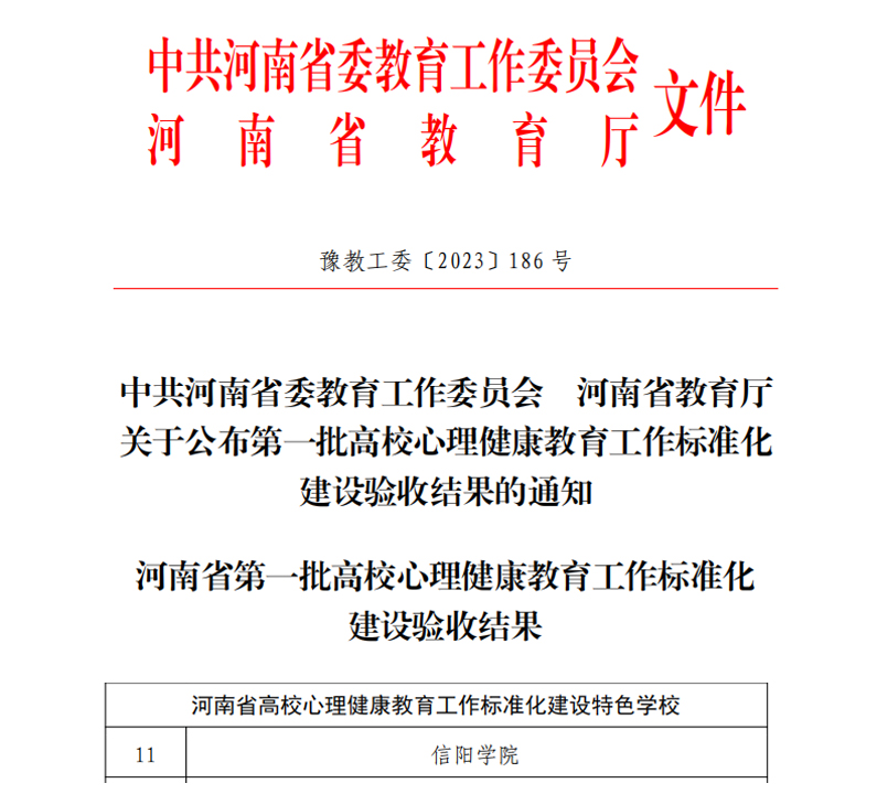 近日,中共河南省委教育工作委员会、河南省教育厅发布《关于公布第一批高校心理健康教育工作标准化建设验收结果的通知》(豫教工委【2023】186号),我校顺利通过验收,并荣获“河南省高校心理健康教育工作标准化建设特色学校”称号。
