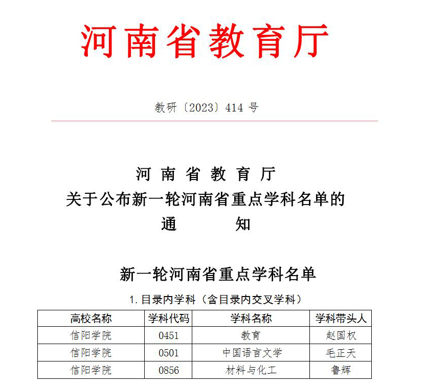 近日,河南省教育厅下发《关于公布新一轮河南省重点学科名单的通知》(教研〔2023〕42号),我校申报的中国语言文学、教育、材料与化工三个学科获批为新一轮河南省重点学科。其中,中国语言文学是我校获批的首个省级一级重点学科,实现了省级重点学科层次和数量的双突破,为学校争先进位和硕士单位建设提供了强有力的支撑。