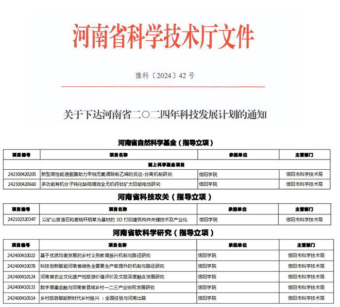 近日,河南省科学技术厅发布《关于下达河南省二〇二四年科技发展计划的通知》(豫科〔2024〕42号),我校8个项目获批立项,其中河南省自然科学基金项目2项,科技攻关项目1项,软科学研究项目5项,总立项数比2023年增加了一倍,创历史新高。理工学院鲁辉教授申报的“新型高性能透氢膜助力甲烷无氧偶联制乙烯的反应-分离机制研究”获批河南省自然科学基金面上项目,董玉静博士申报的“多功能有机分子钝化缺陷增效全无机钙钛矿太阳能电池研究”获批河南省自然科学基金青年项目,是我校首次获批该类项目,实现了新的突破。