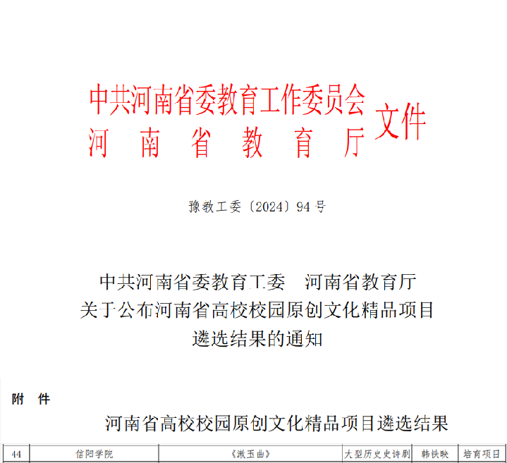近日,河南省委教育工委、河南省教育厅下发《关于公布河南省高校校园原创文化精品项目遴选结果的通知》(豫教工委〔2024〕94号)。我校申报的大型原创历史史诗剧《漱玉曲》获评培育项目。
