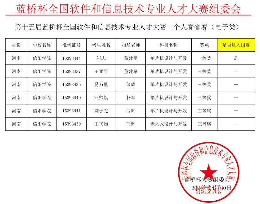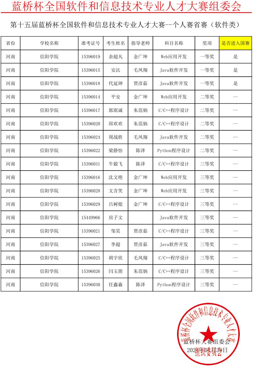 近日,由工业和信息化部人才交流中心主办的第十五届“蓝桥杯”全国软件和信息技术专业人才大赛河南赛区获奖名单公布。我校大数据与人工智能学院的29名学生参加了C/C++程序设计、Java程序设计、Python程序设计、Web应用开发、单片机设计与开发及嵌入式设计与开发等六个科目的比赛,经过激烈角逐,共获一等奖4项,二等奖5项,三等奖15项。安沆、代延珅、余超凡及崔志等4名学生凭借出色的表现,在省赛中脱颖而出,荣获一等奖,并成功晋级国赛。