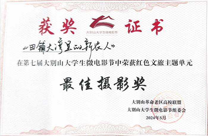 近日,第七届大别山大学生微电影节落下帷幕,由我校文学院广播电视编导专业袁培俊同学执导,苏国梁、贾佳、晏义犀主创的纪录片《田铺大湾里的新农人》从海内外高校1500余部参赛作品中脱颖而出,与北京电影学院、中国传媒大学、上海戏剧学院等高校作品一同角逐各单元奖项,获得最佳摄影奖。