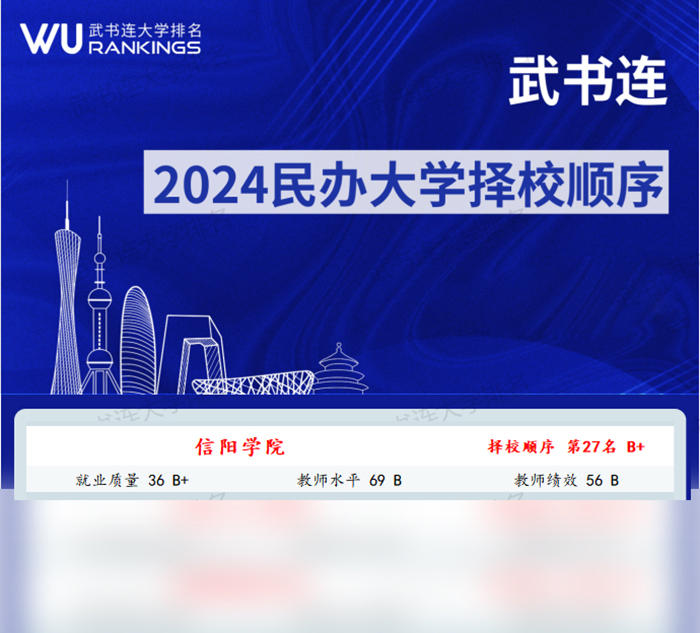 近日,高等教育专业评价机构“武书连大学排名”发布了“2024中国民办大学择校顺序排名”,在上榜的230所民办大学中,信阳学院位居全国民办大学第27名,全省民办大学第2名。亮眼的成绩充分展现了信阳学院在同类高校中较强的综合实力和强劲的发展势头,也是家长口碑、学生选择、社会评价的集中体现。