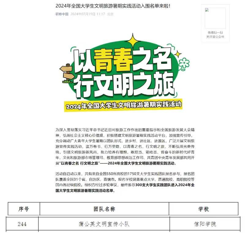 7月下旬,由文化和旅游部市场管理司、教育部思想政治工作司、共青团中央青年发展部共同开展“以青春之名 行文明之旅”——2024年全国大学生文明旅游暑期实践活动入选名单出炉,本次活动有来自全国550所高校的1750支大学生实践团队报名参与,由我校文学院朱璐璐担任指导老师,文学院张培琳、刘雨姗、常文青、张静芳、田家宁、周晓雯、张子健七名学生组成的蒲公英宣传小队成功入选。