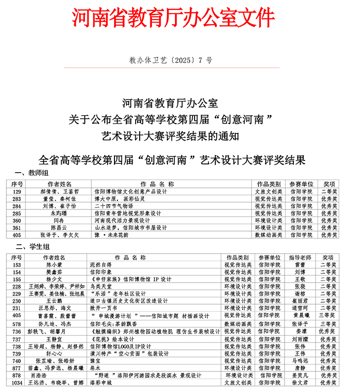 近日,河南省教育厅下发了《关于公布全省高等学校第四届“创意河南”艺术设计大赛评奖结果的通知》(教办体卫艺〔2025〕7号)文件,我校荣获二等奖8项、三等奖2项,优秀奖14项;以上24项获奖作品中教师组7件,学生组17件。