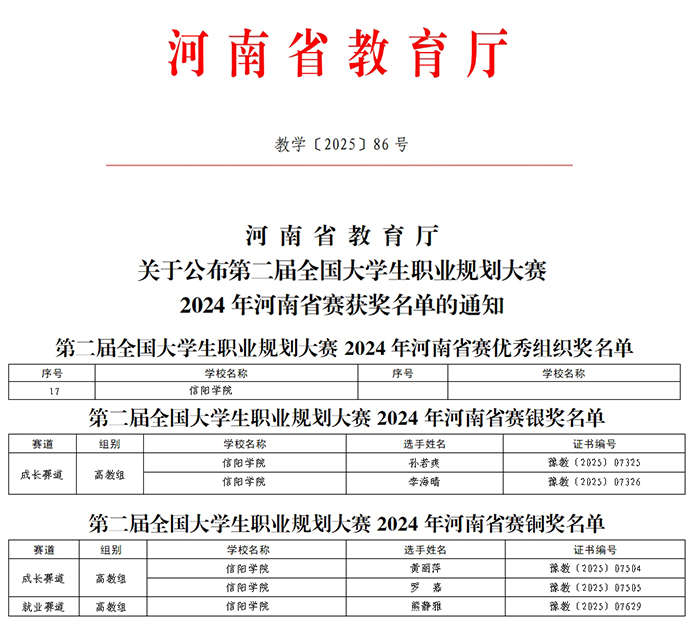 近日,第二届全国大学生职业规划大赛2024年河南省赛成绩揭晓,我校学子荣获2银3铜佳绩,大数据与人工智能学院李海晴同学、文学院孙若爽同学荣获高教组成长赛道银奖;文学院罗嘉同学、音乐学院黄丽萍同学荣获高教组成长赛道铜奖;音乐学院熊静雅同学荣获高教组就业赛道铜奖。同时,学校荣膺大赛“优秀组织奖”。