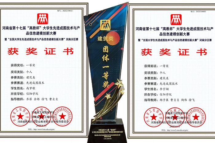近日,河南省第十七届“高教杯”大学生先进成图技术与产品信息建模创新大赛(暨“全国大学生先进成图技术与产品信息建模创新大赛”河南省分区赛)圆满落幕。我校土木工程学院代表队凭借着独特的创新思维、超强的团队协作精神及过硬的实践操作能力从众多参赛队伍中脱颖而出,共获21项大奖。其中获得建筑类团体一等奖1项;建筑类先进成图技术赛道个人一等奖2项,建筑类先进成图技术赛道个人二等奖5项,建筑类先进成图技术赛道个人三等奖10项;建筑类BIM创新应用赛道团体三等奖1项;建筑类智能建筑结构设计赛道团体三等奖2项。