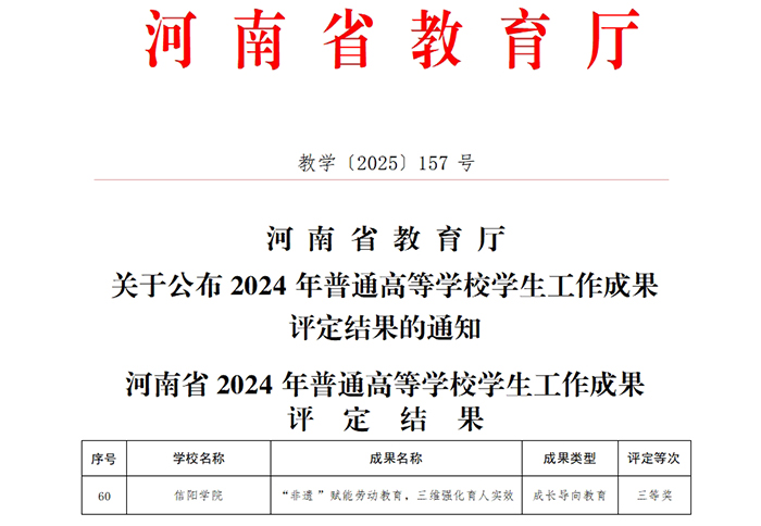 近日,河南省教育厅发布《关于公布2024年普通高等学校学生工作成果评定结果的通知》(教学〔2025〕157号),我校团委申报的项目《“非遗”赋能劳动教育,三维强化育人实效》荣获三等奖。