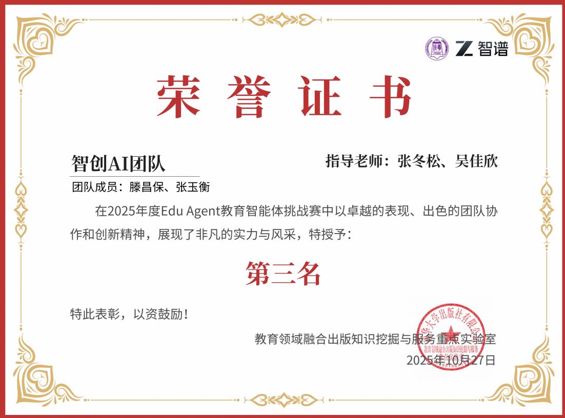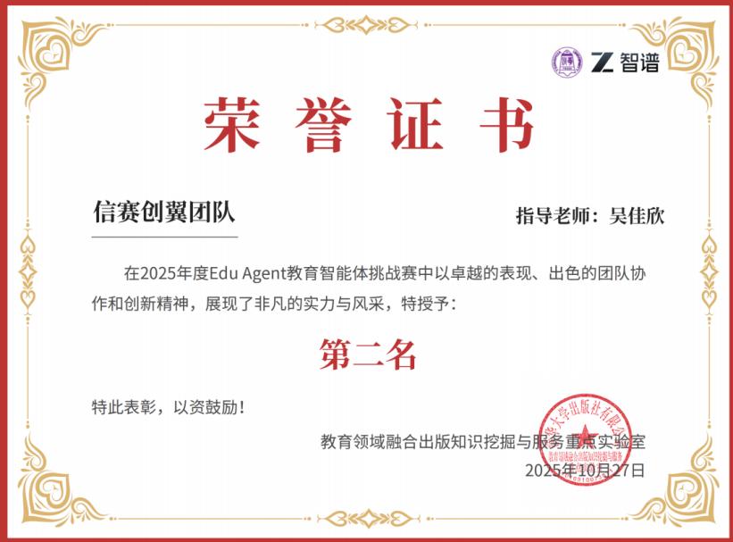 近日,2025EduAgent教育智能体挑战赛正式落下帷幕,经过报名提交、专家评审、决赛等多环节评审,最终我校大数据与人工智能学院信赛创翼团队凭借特色项目斩获第二名,智创AI团队获第三名。该赛事由教育领域融合出版知识挖掘与服务重点实验室主办、北京智谱华章科技股份有限公司承办。