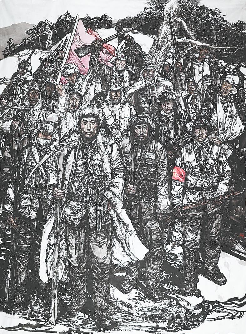这幅水墨人物画以东北抗联历史为创作内核,聚焦杨靖宇将军与抗联战士的英雄群像,在艺术表达上兼具思想深度与视觉冲击力。画面中,杨靖宇将军身形如松、目光如炬,尽显民族英雄的刚毅与坚定;周围的抗联战士或持枪戒备、或举旗前行,脸上的风霜痕迹与衣纹的褶皱肌理,均通过水墨皴擦点染的传统技法细致呈现,既还原了东北林海的严寒风雪,更镌刻了抗日战争时期中华民族的苦难印记与坚韧风骨。尤为点睛的是,画面中醒目的红色旗帜与袖标,如黑暗中的火种般点亮视觉焦点。这抹红色既是抗联战士革命理想的象征,更暗合中原大地对英雄热血精神的呼应。袁汝波教授作为河南本土艺术家,深挖地方红色文化资源,以笔墨为桥,将中原文化语境与革命文化紧密相连。