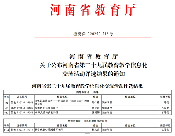 近日,河南省教育厅公布了《关于公布河南省第二十九届教育教学信息化交流活动评选结果的通知》(教资保〔2025〕218号)文件,我校教师获二等奖1项,三等奖3项。其中,理工学院刘仁植老师的微课作品荣获二等奖,教育学院杨立昊老师、文学院翟丽娜老师的微课作品荣获三等奖,教育学院杨贝贝老师的信息化教学课程案例荣获三等奖。