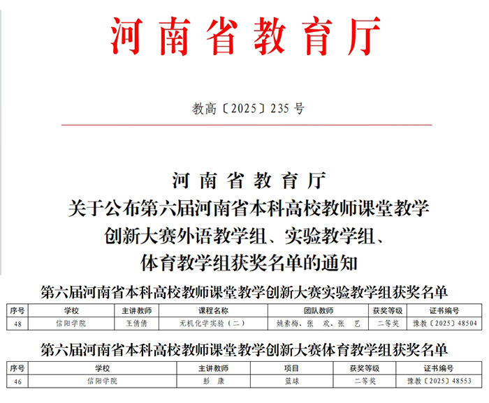近日,第六届河南省本科高校教师课堂教学创新大赛外语教学赛道、体育教学赛道、实验教学赛道比赛结果揭晓。我校理工学院王倩倩荣获实验教学赛道二等奖,公共体育教学部彭康荣获体育教学赛道二等奖。