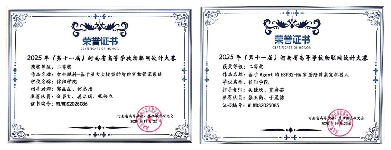 我校大数据与人工智能学院高度重视此次赛事,精心选拔优秀学子组建2支代表队参赛。经过作品展示、设计思路汇报、现场答辩等多环节的激烈比拼,学校两项参赛作品“基于星火大模型的智能宠物管家系统”和“基于Agent的ESP32-HA家居陪伴桌宠机器人”脱颖而出,均斩获大赛二等奖。